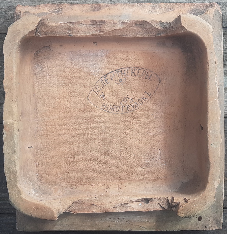 Завод: Минская губерния, Новогрудский уезд, г.Новогрудок. Изразец произведен на изразцовом заводе братьев Иосифа и Густава Германовичей Лейтнекеров. Завод впервые оказался в справочниках в 1887г. и записан за их отцом мещанином Германом Альбертовичем с датой основания 1862г. Около 1900г. им стали владеть его сыновья и работали до 1917г.