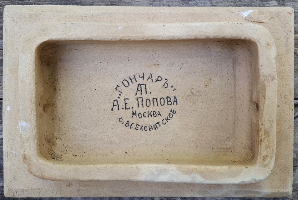 Завод: Московская губерния, Московский уезд, с.Всехсвятское. Единственное упоминание о данном заводе «Гончар» находится в 1907-1909гг. с указанием лишь инициалов владелицы А.Е.Поповой. На другом варианте клейма этого завода присутствует год «1899».