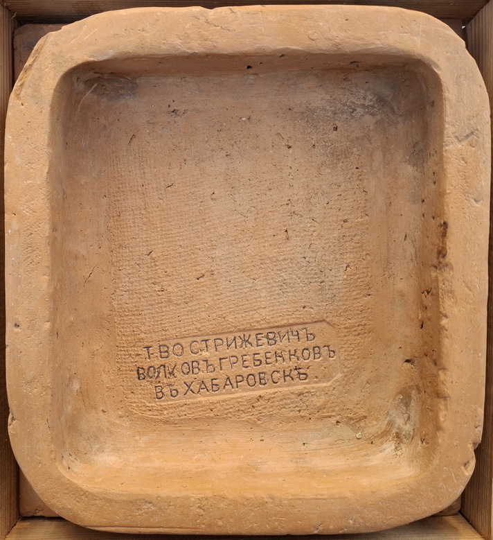 Владельцы: Приморская Область, Хабаровский уезд. На сегодняшний момент не удалось обнаружить никаких данных о производстве изразцов на заводе Степана (Стефана) Миновича Стрижевича, Матвея Семеновича (Симеоновича) Волкова и Льва Мартыновича Гребенькова. Их имена стали известны лишь благодаря записям в Метрических книгах хабаровских Церквей актов регистрации рождений и бракосочетаний[1,2]. С.М.Стрижевич в 1910г. назван крестьянином Могилевской губернии и уезда, Курляндской волости дер.Слободка как и Л.М.Гребеньков, а М.С.Волков – мещанином Минской губернии из г.Бобруйска. В 1914г. Степан Минович Стрижевич указан проживающим в с.Чичаговка Хабаровского уезда в 20км на северо-восток от Хабаровска, которое организовали украинские и белорусские переселенцы в 1912г[3]. Возможно, там и находилось гончарное заведение, по крайней мере есть сведения об известковом производстве в Чичаговке. Не удивительно, что бывшие жители Могилевской губернии, известного центра изразцового производства в Российской Империи, организовали на новом месте жительства подобное предприятие.