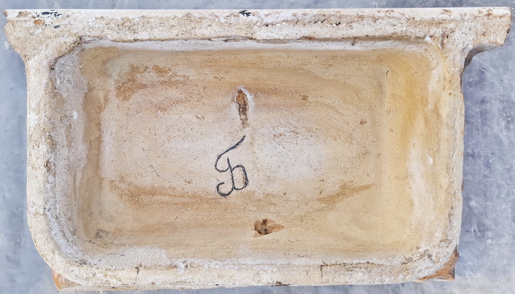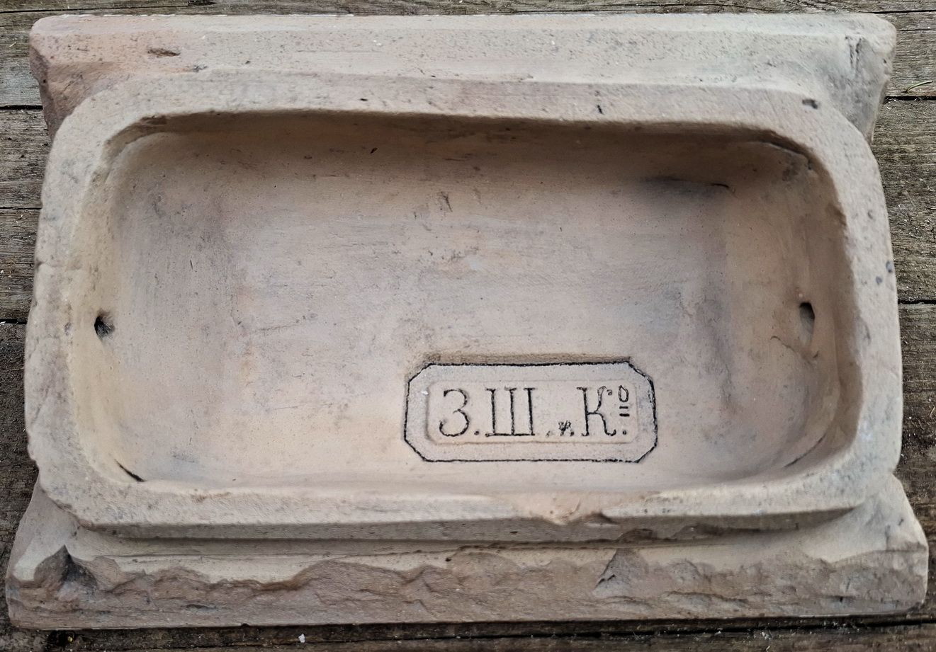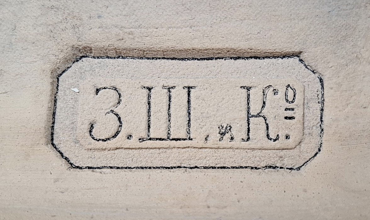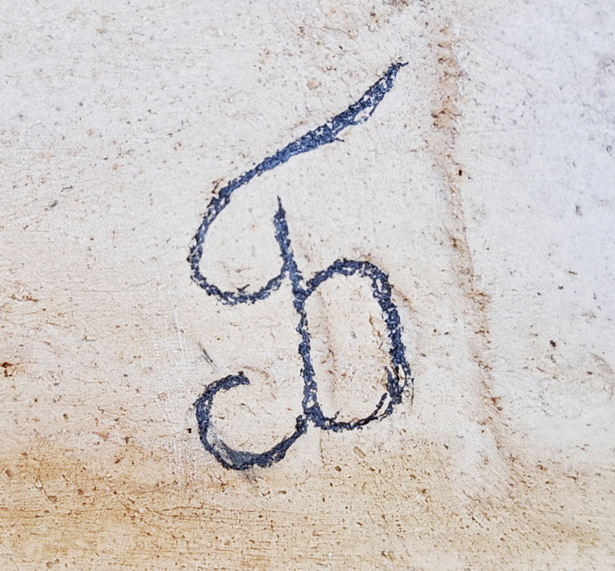 Найден в центе Санкт-Петербурга. Вместе с ним были изразцы с клеймами "Драготино" В.В.Комарова из Новгородской губернии. По предположению могут относится к черепично-гончарному заводу А.П.Беляева близ г.Крестцы с 1893г. Производил черепицу, трубы, изразцы, гончарные изделия. Кроме географического соседства версия пока ничем не подтверждена.