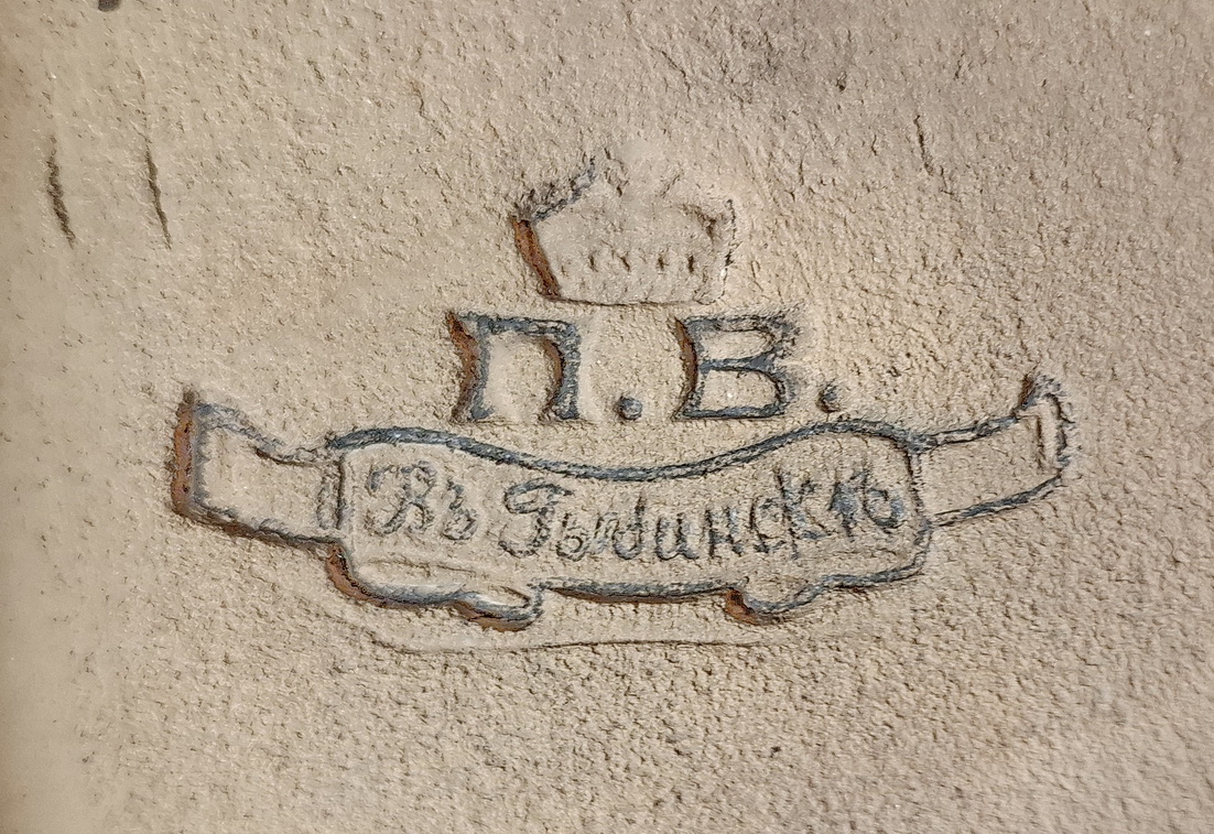 Завод: Ярославская губерния, Рыбинский уезд, Ивановская волость. Производство на гончарном заводе было основано в конце XIX века в деревне То(а)говщина (теперь это промзона города Рыбинска между р.Волга и пр.Ленина и пр.Серова) князем Петром Михайловичем Волконским. В 1906г. завод перешел во владение Рыбинского Лесопромышленного Общества (см. здесь)[1].